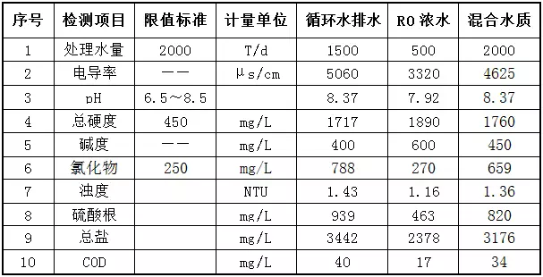 廠區(qū)內(nèi)現(xiàn)有項(xiàng)目產(chǎn)生的循環(huán)排污水和反滲透濃水均排入10000 m3/d污水處理廠內(nèi)處理。由于此部分水量較大,對(duì)污水處理站負(fù)擔(dān)大,且對(duì)水資源也是一種浪費(fèi)。經(jīng)齊魯制藥相關(guān)技術(shù)人員化驗(yàn)得知,此部分高濃度廢水電導(dǎo)率、硬度、濁度和鹽分較高,而COD較低,如果直接排入污水處理車(chē)間進(jìn)行處理不太合理,不僅會(huì)加重污水處理的成本,處理效果也不夠理想。
