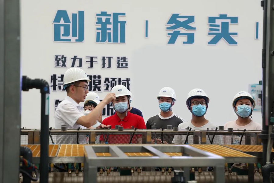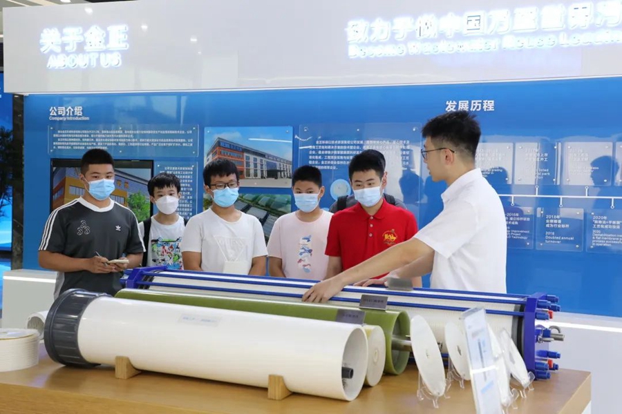青少年志愿者們依次走訪了公司大數(shù)據(jù)中心、展廳、膜中心、組裝車間、研發(fā)實(shí)驗(yàn)室等地。在這里,志愿者們近距離了解,世界領(lǐng)先的污廢水資源化和高品質(zhì)再生水回用工藝技術(shù),實(shí)現(xiàn)年減排污廢水7300萬(wàn)噸;聆聽“中國(guó)人用自己的工藝包”解決“卡脖子”的發(fā)展難題”,打破國(guó)外技術(shù)壟斷的項(xiàng)目故事;感知世界領(lǐng)先的“特種膜全自動(dòng)化生產(chǎn)線”,如何集聚工業(yè)互聯(lián)網(wǎng)、工業(yè)機(jī)器人、5G等先進(jìn)技術(shù),開啟世界膜工業(yè)智能制造時(shí)代。